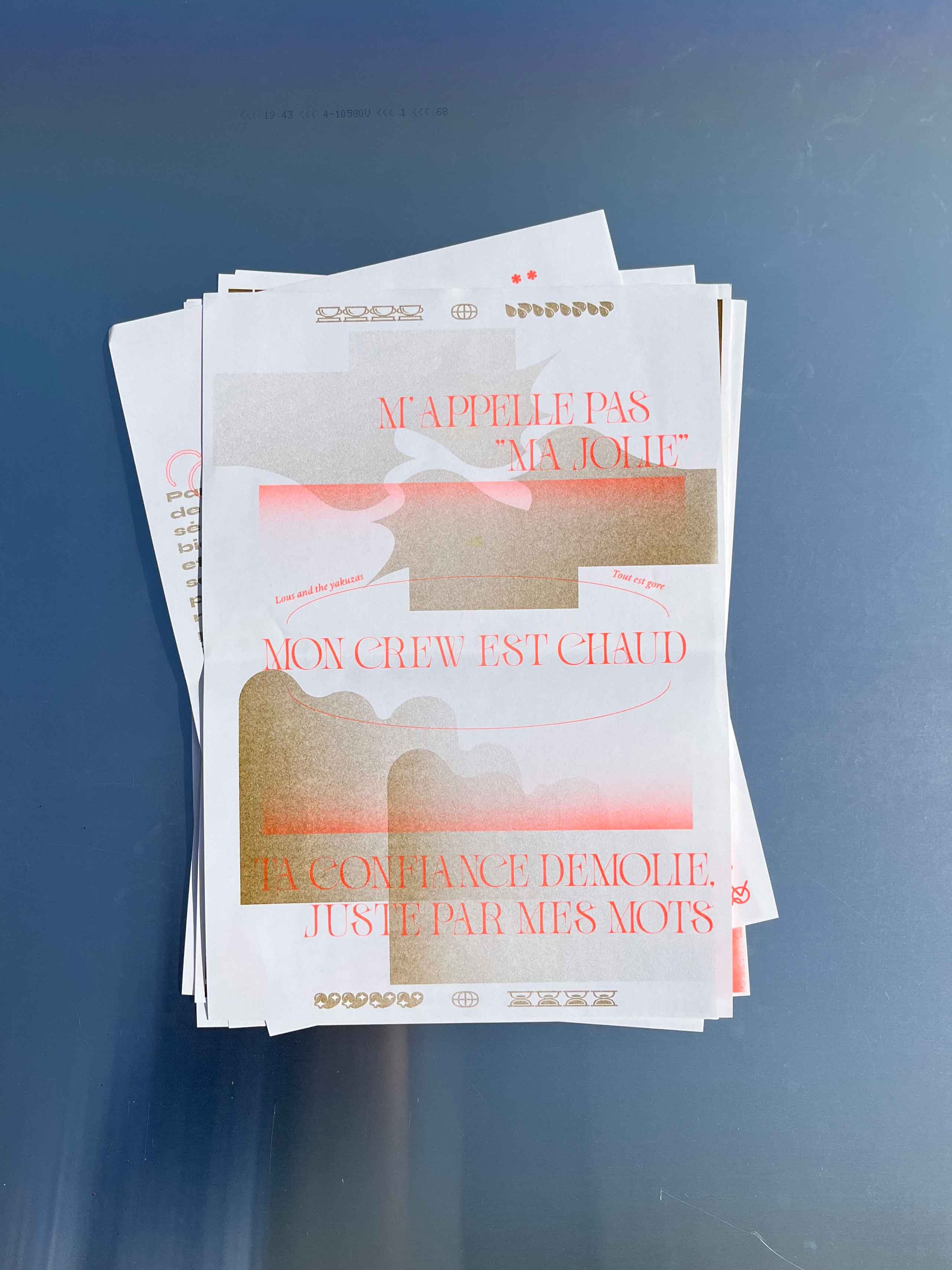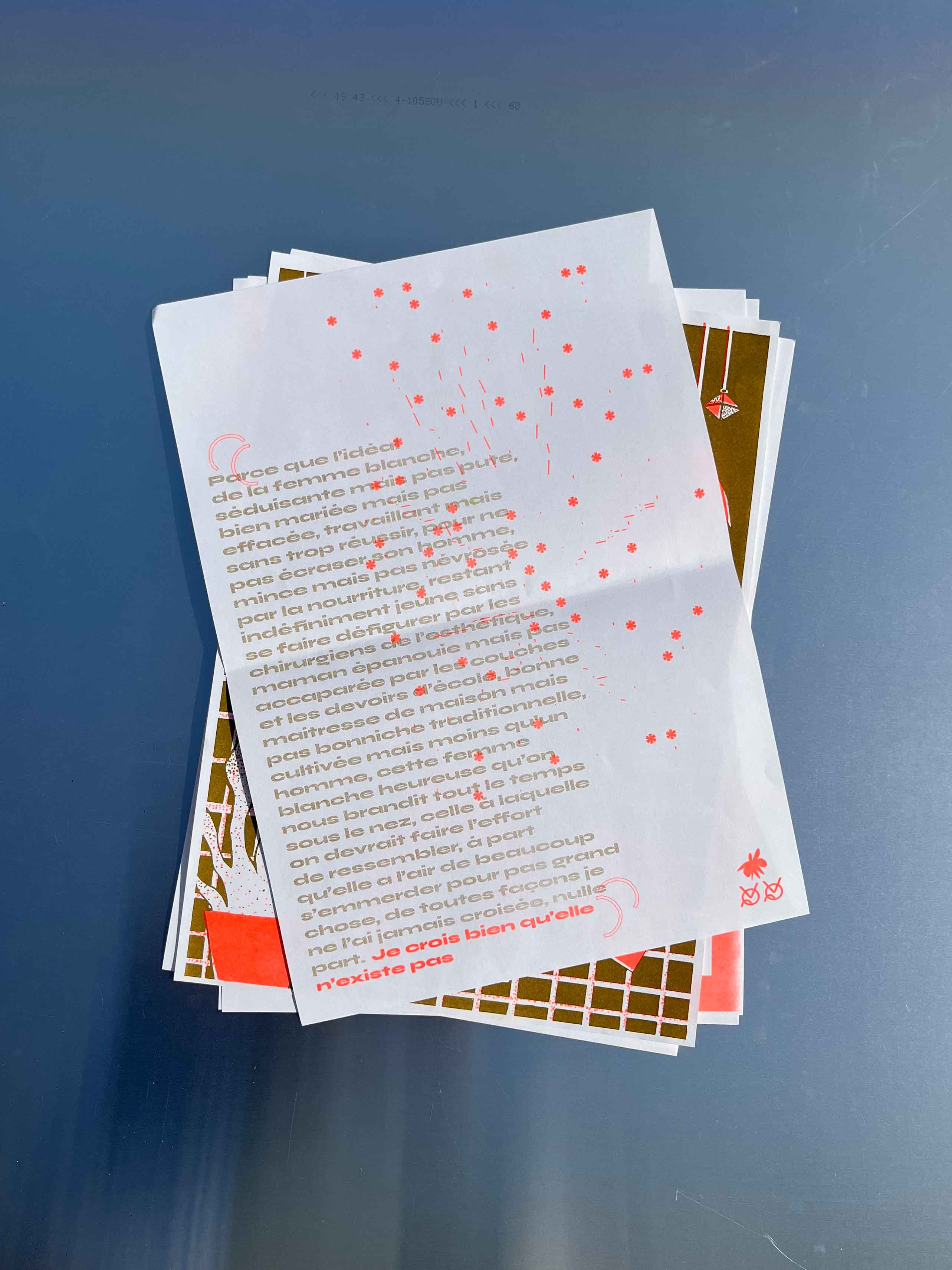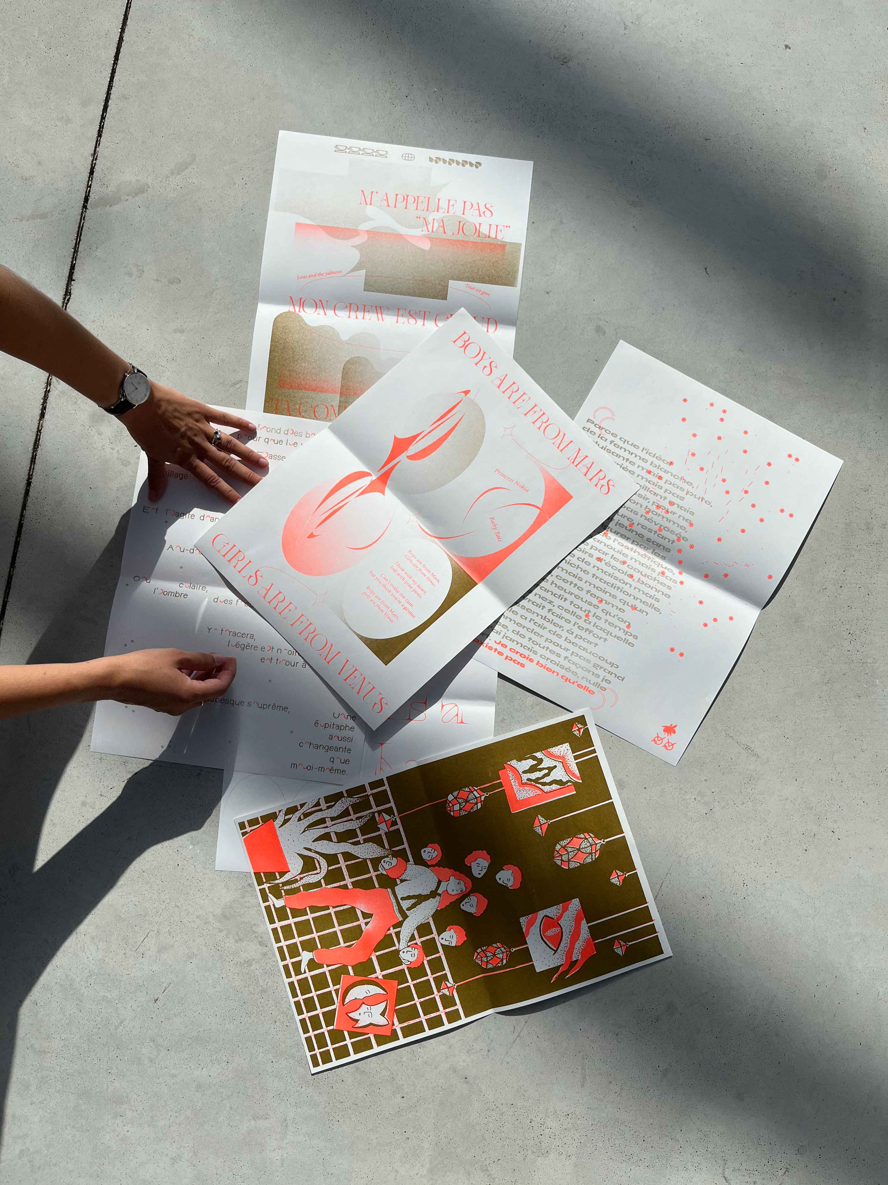 Édition de 6 affiches imprimées en risographie, deux couleurs, d’après les écrits de Virginie Despentes, Gérard d’Houville alias Marie de Heredia ou de Régnier et Irene. Ainsi que les musiques des rappeuses Princess Nokia et Lous and the Yakuza. Au recto on retrouve des compositions graphiques textuelles et visuelles associées à chaque oeuvres des femmes artistes et au verso les références des ouvrages ainsi que le contenu intégral des paroles de musique de rap.