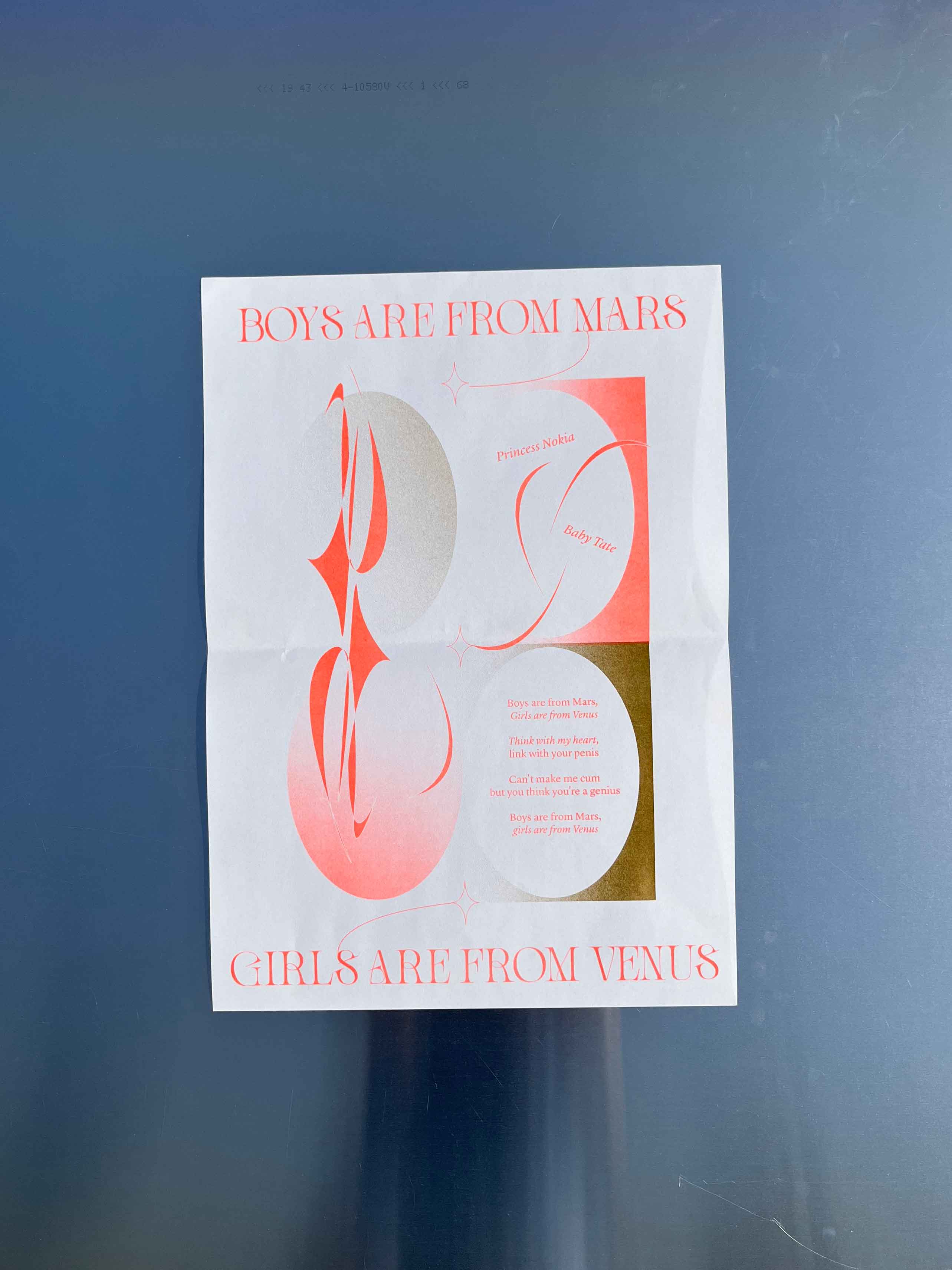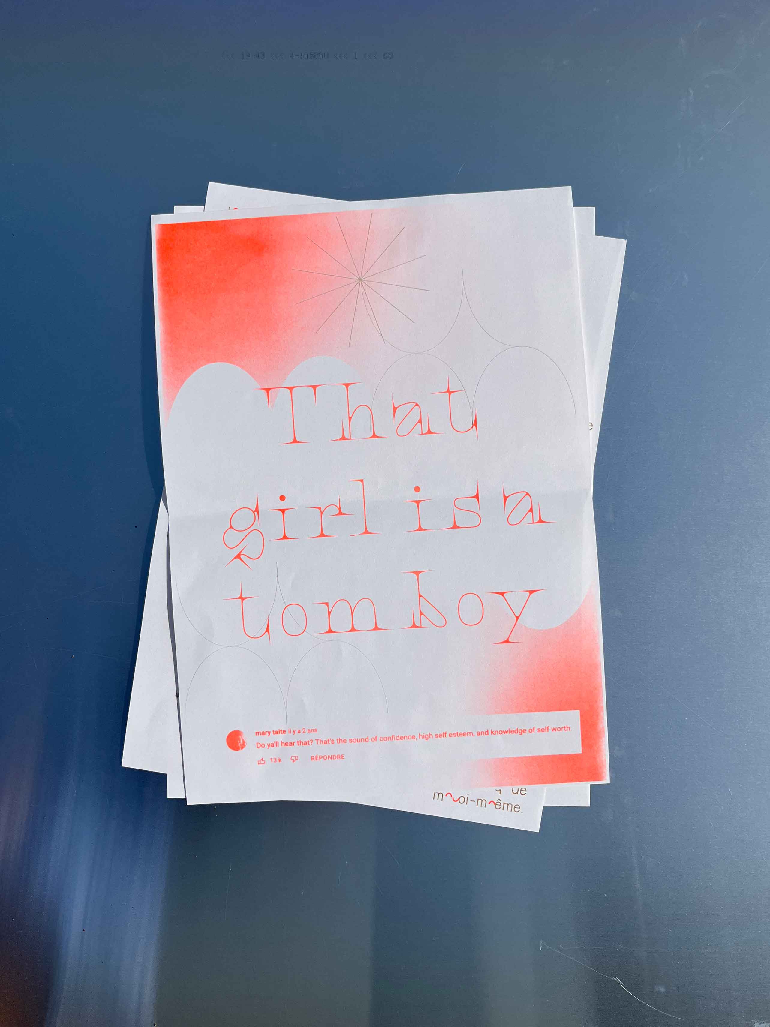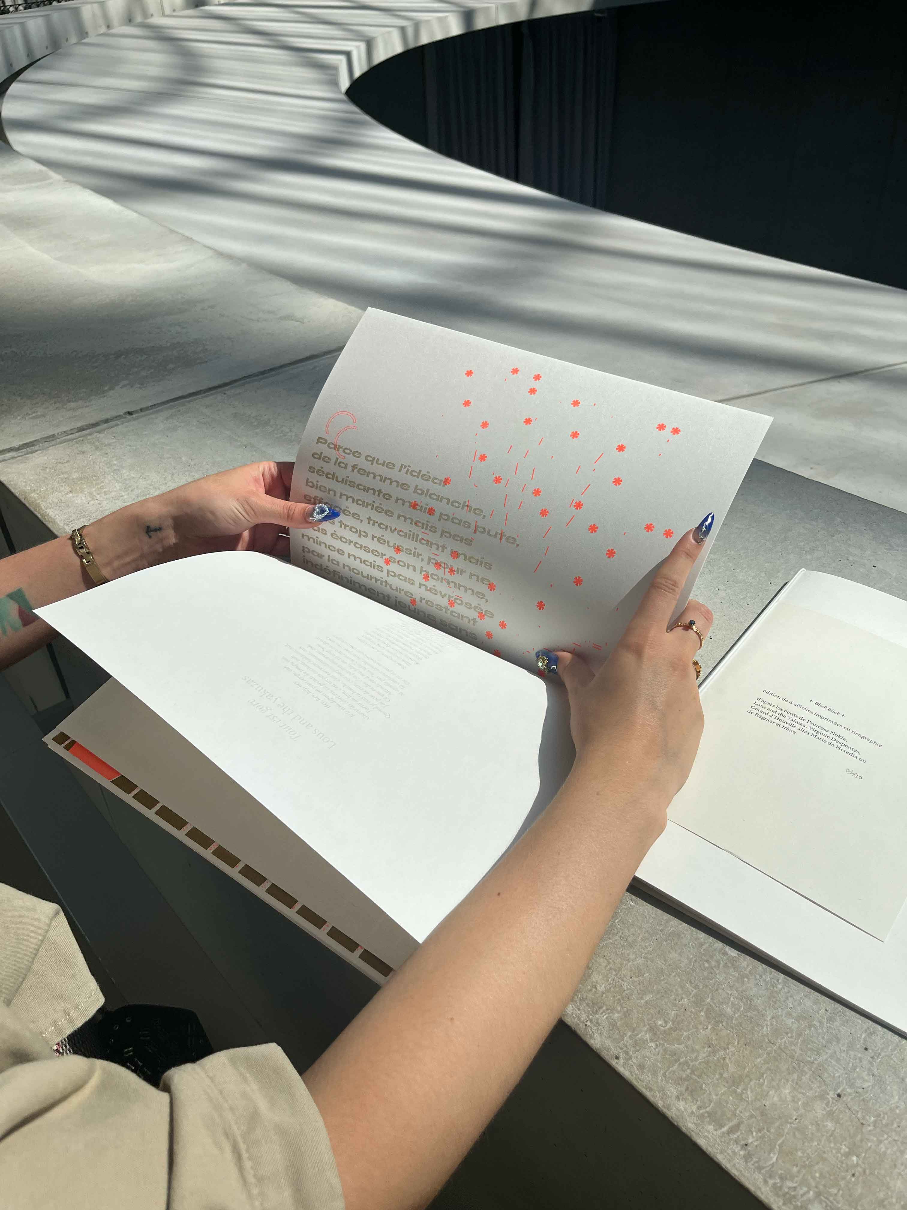 Édition de 6 affiches imprimées en risographie, deux couleurs, d’après les écrits de Virginie Despentes, Gérard d’Houville alias Marie de Heredia ou de Régnier et Irene. Ainsi que les musiques des rappeuses Princess Nokia et Lous and the Yakuza. Au recto on retrouve des compositions graphiques textuelles et visuelles associées à chaque oeuvres des femmes artistes et au verso les références des ouvrages ainsi que le contenu intégral des paroles de musique de rap.