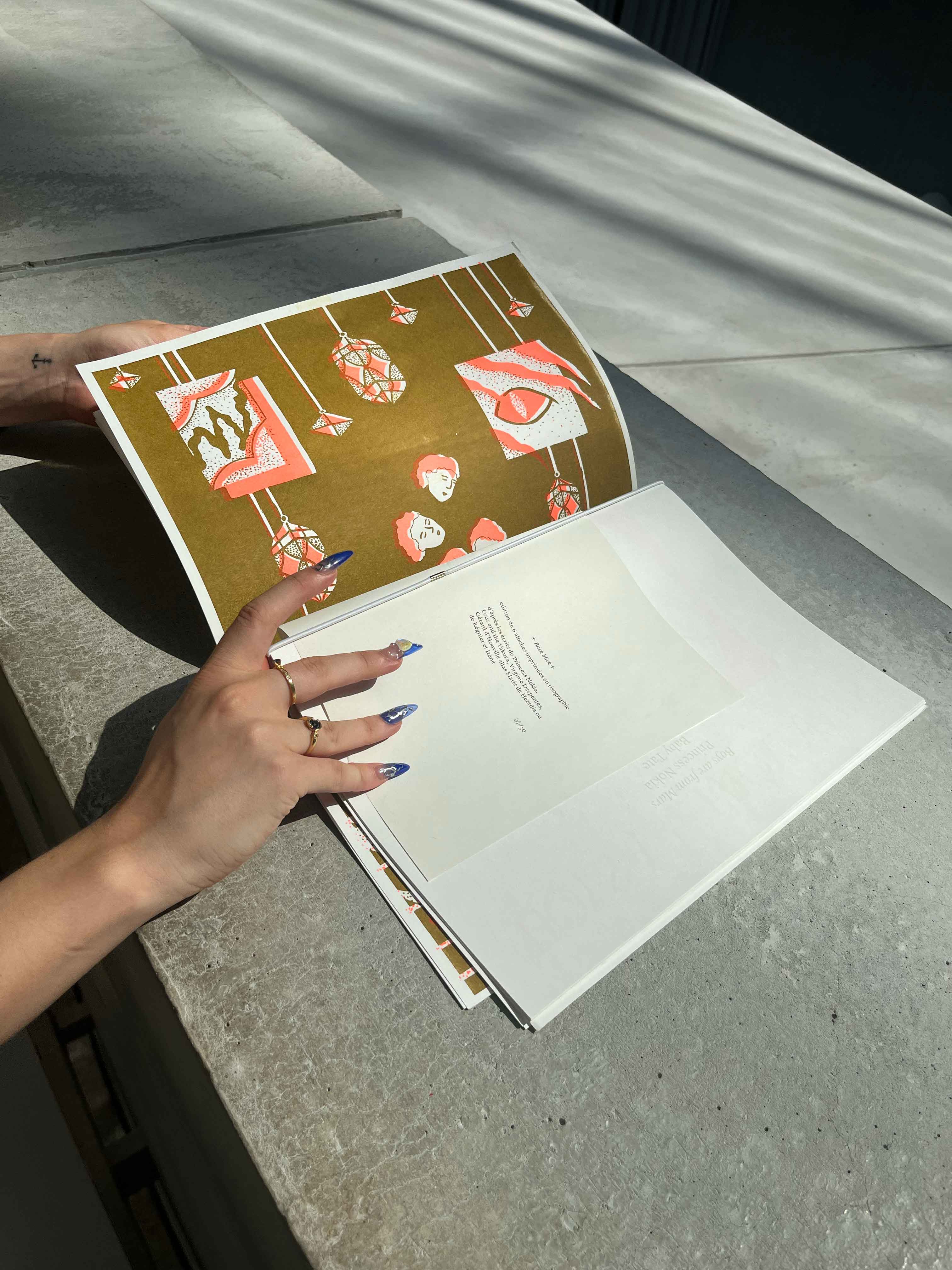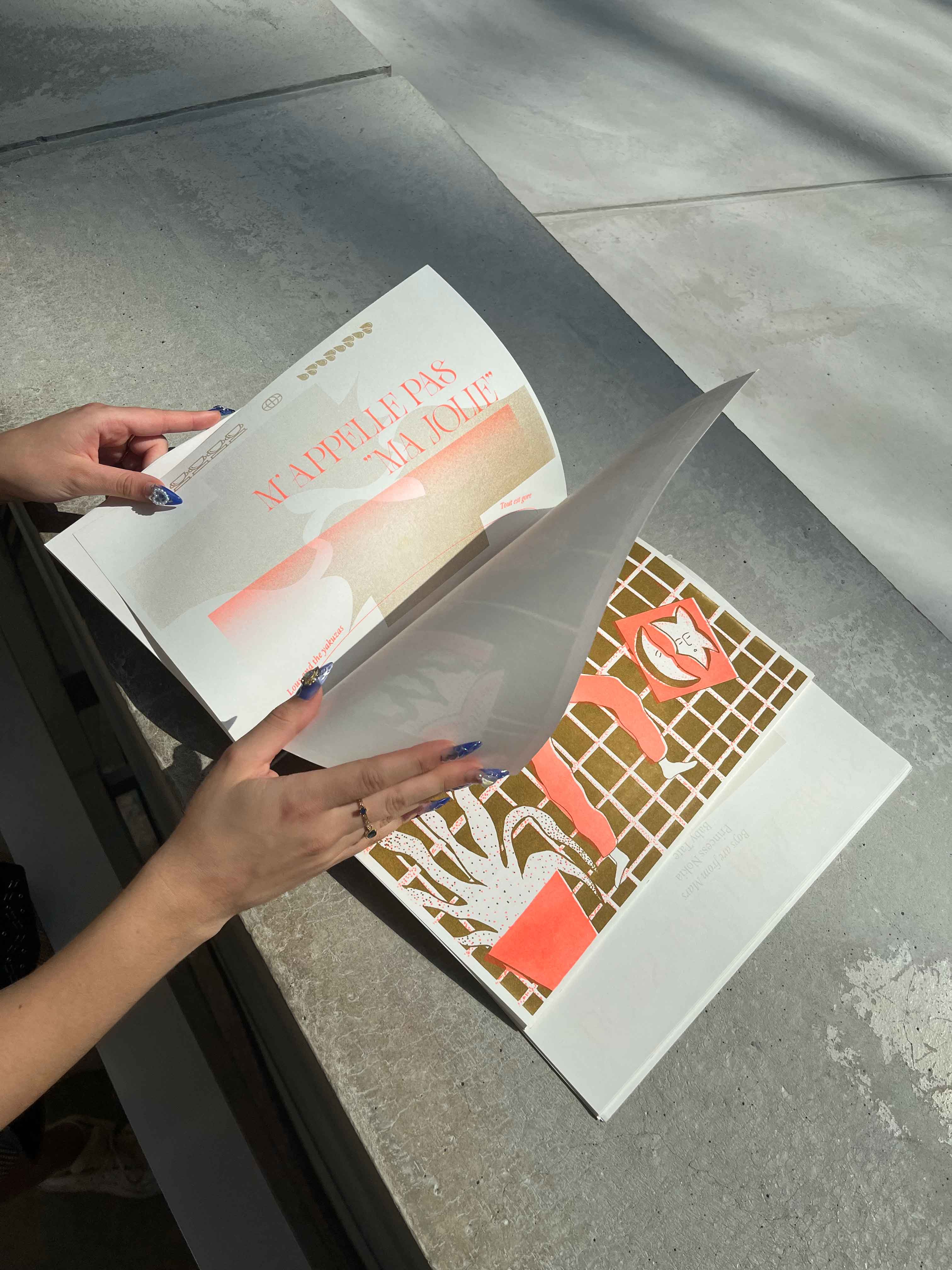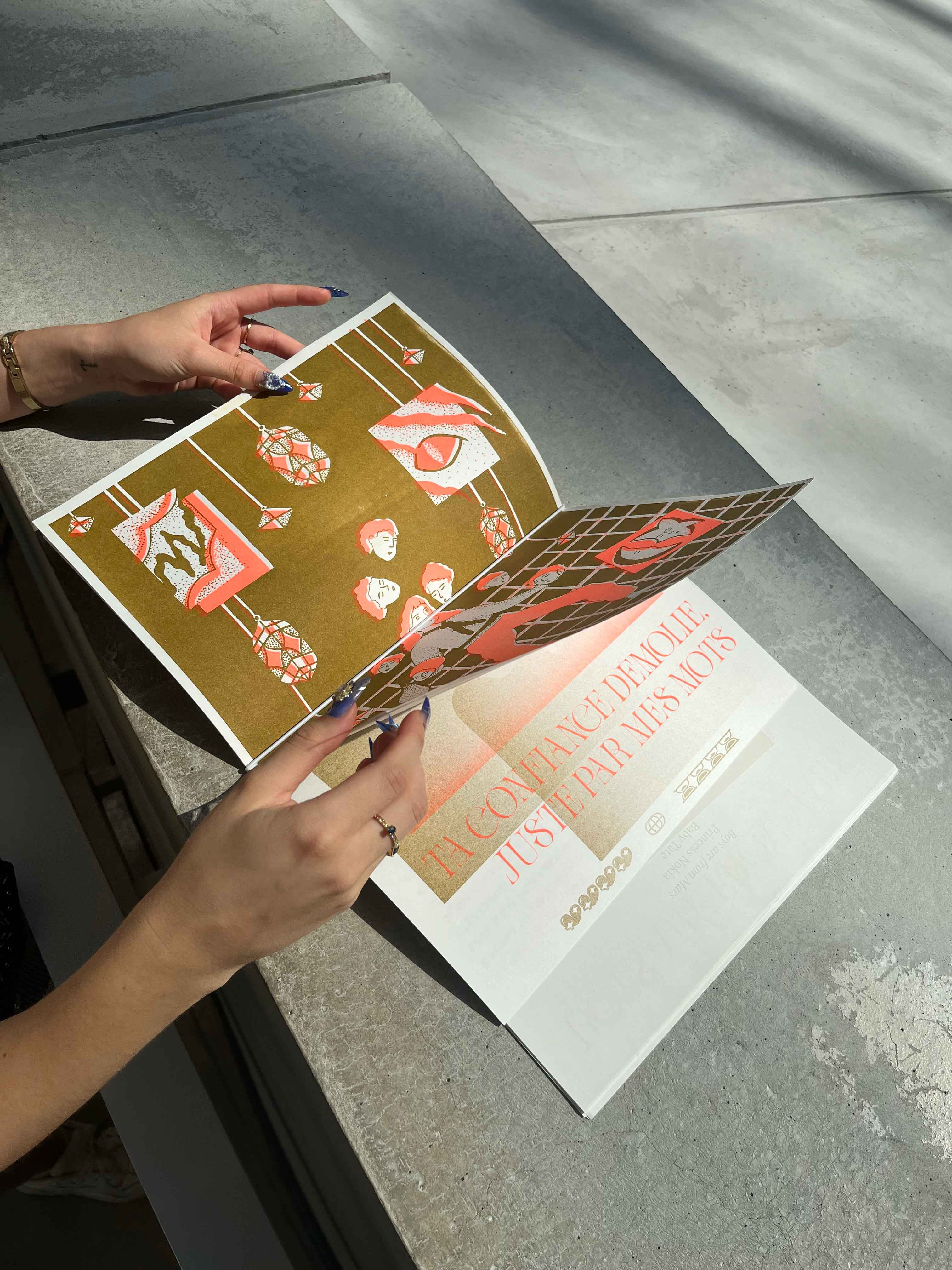 Format A3, impression en risographie orange et gold, reliure élastique, A4, 30 éditions limitées numérotées.