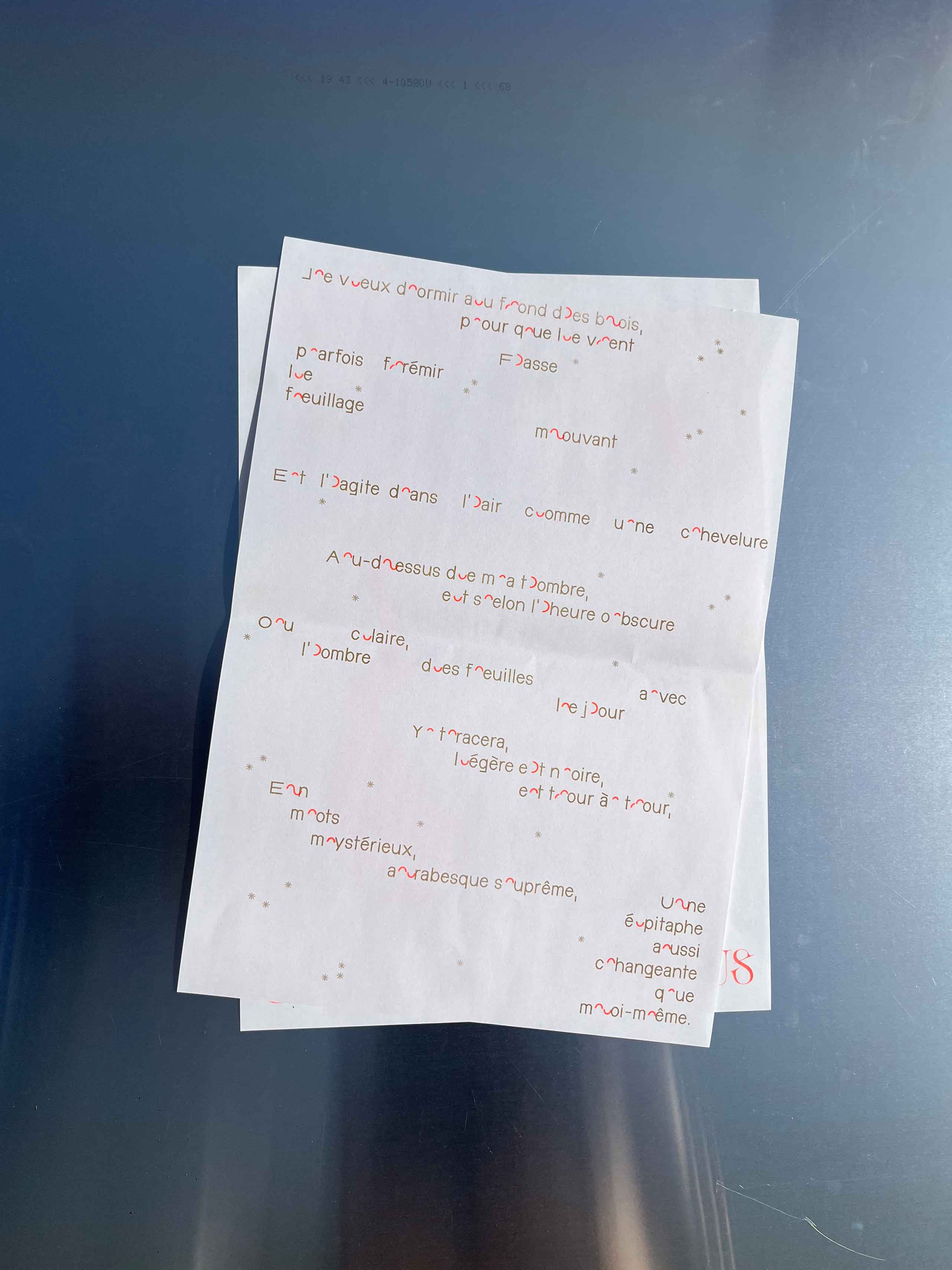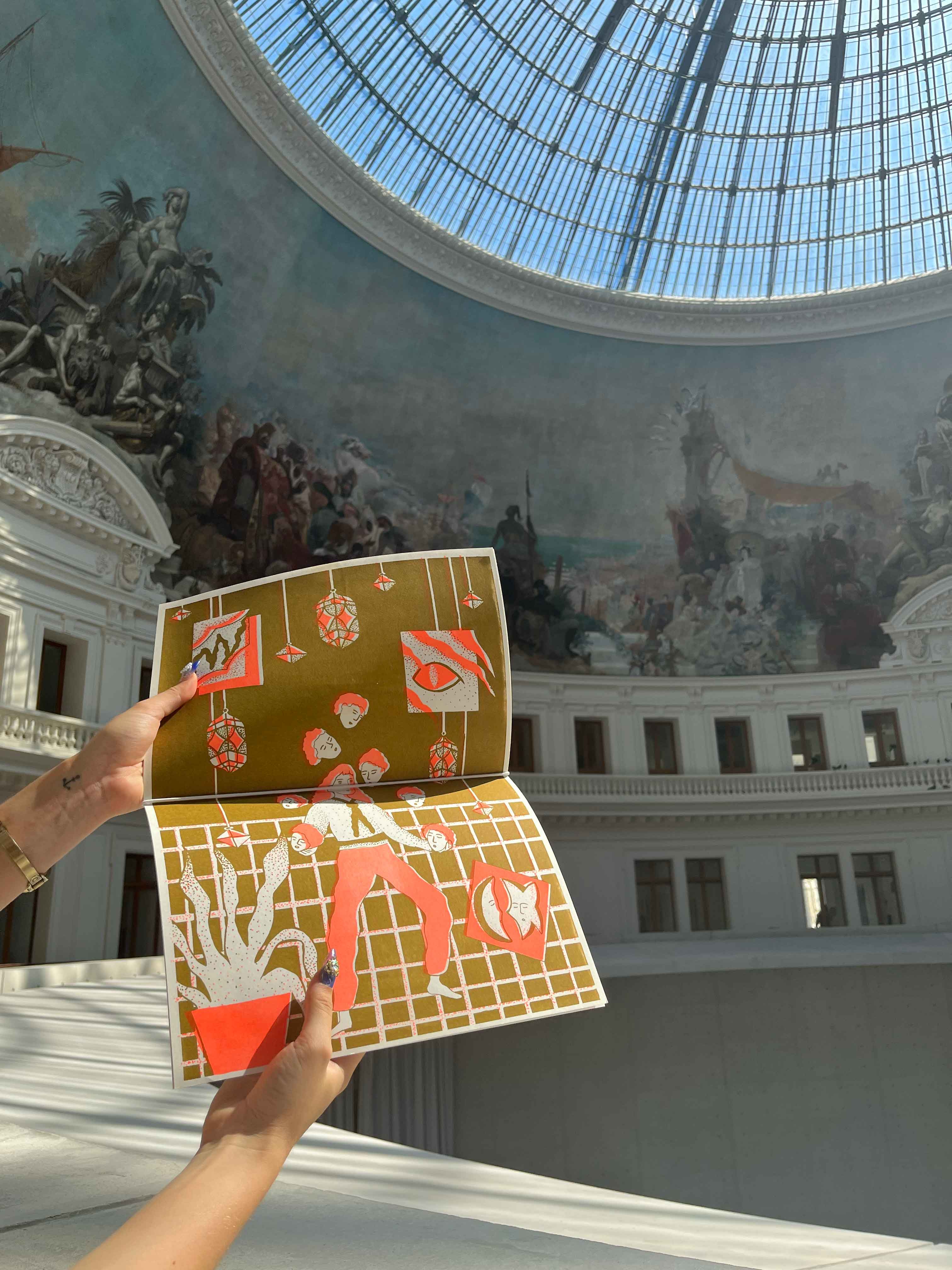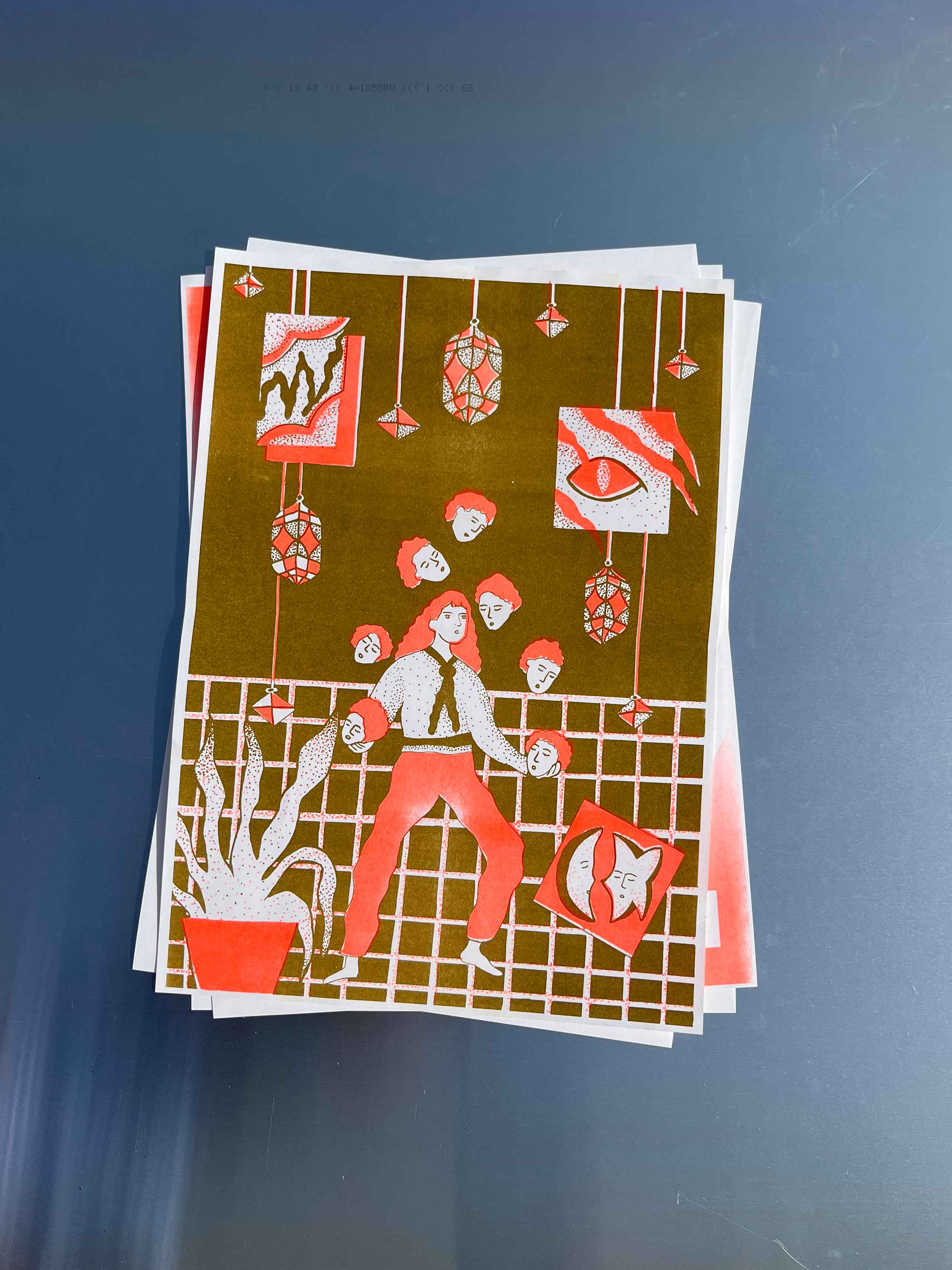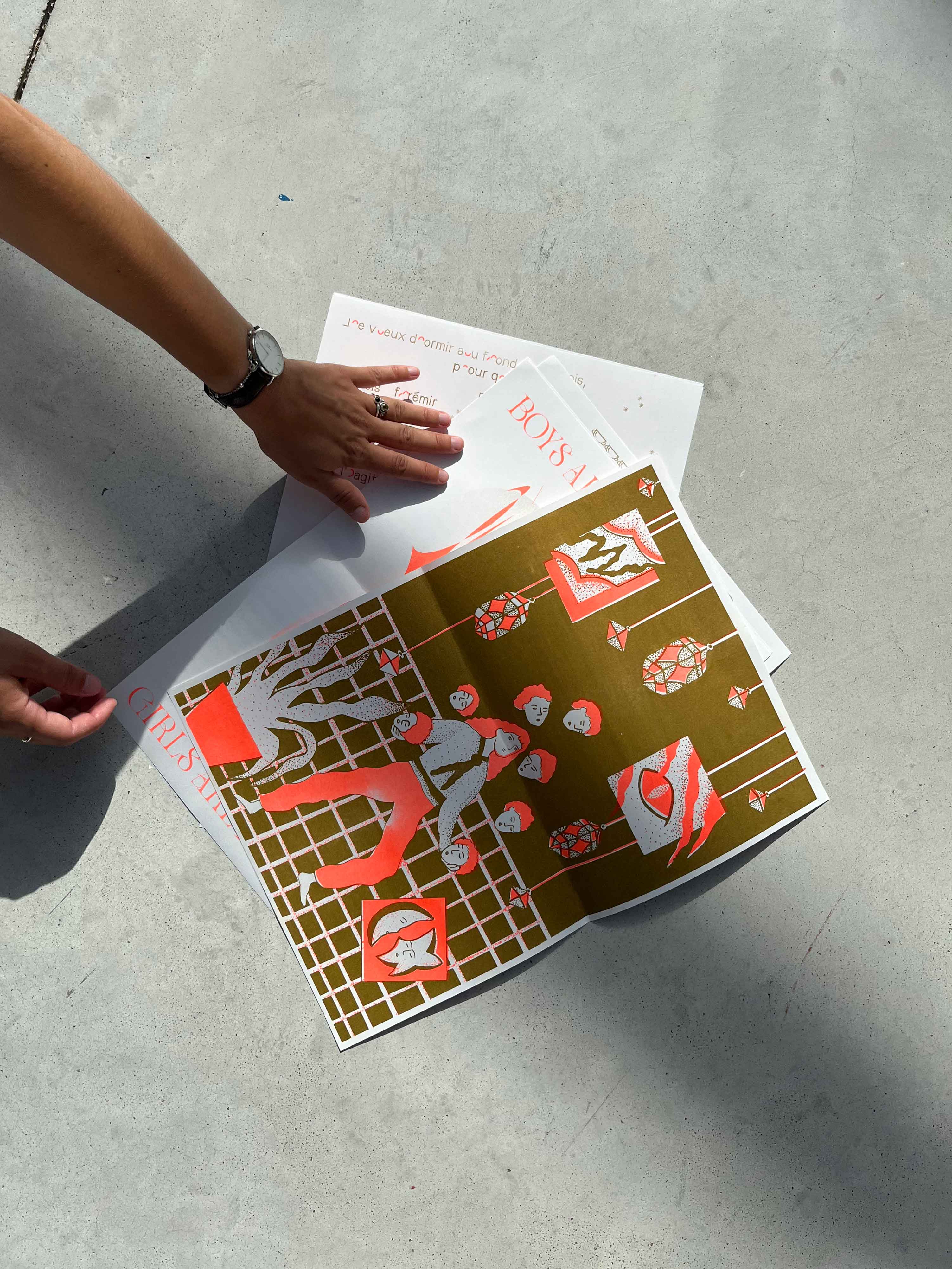 Format A3, impression en risographie orange et gold, reliure élastique, A4, 30 éditions limitées numérotées.