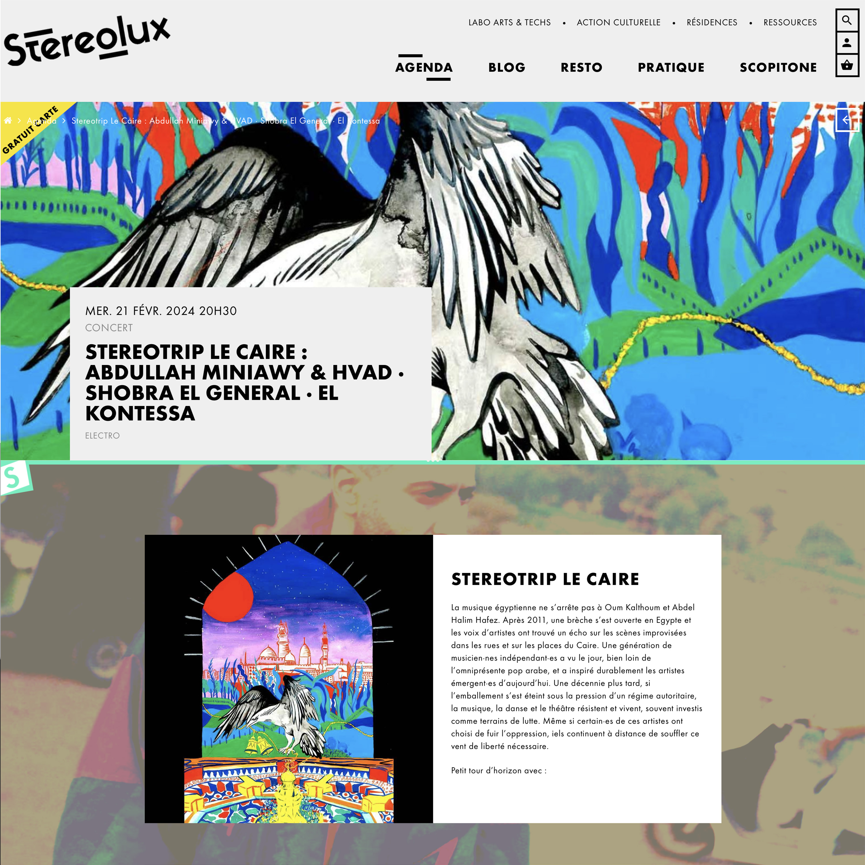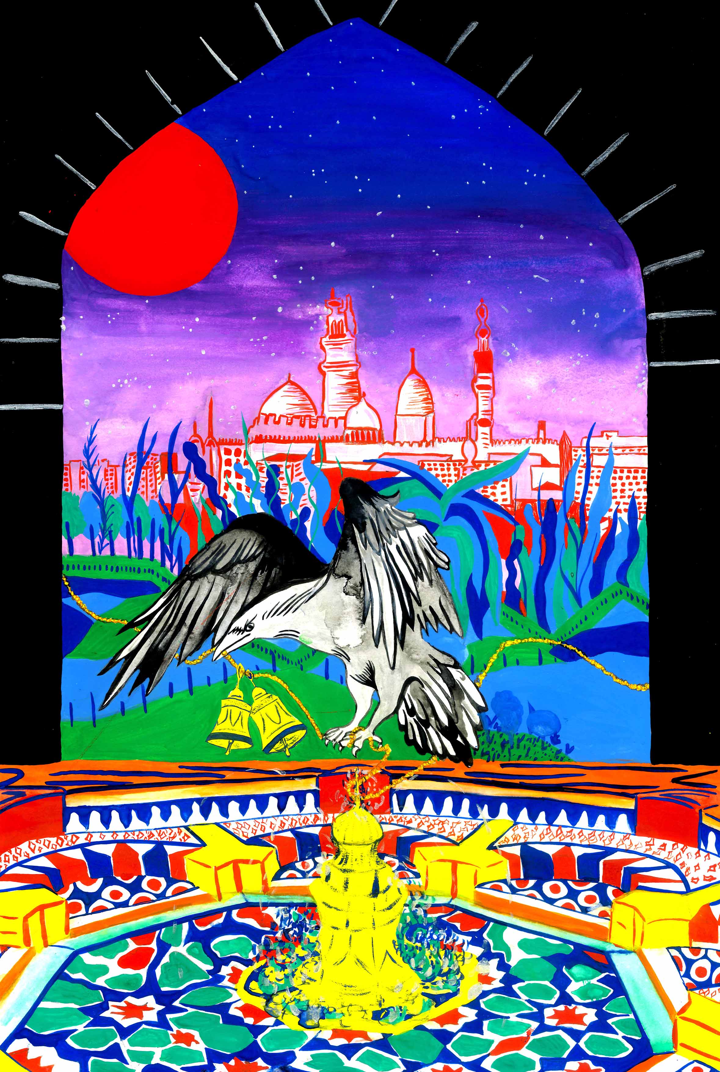 Peinture à la gouache pour une soirée au @stereolux_scopitone inspiré d’une ancienne légende égyptienne selon laquelle, lors de la dynastie des Fatimides (909-1171), une muraille fut construite dans le but de protéger la ville. Des cordes avec des clochettes avaient été placées par les astronomes pour choisir le moment idéal de la reconstruction. Alors que la planète Mars était à son zénith, des corbeaux se posèrent dessus, les faisant sonner. Ainsi est né le nom « al-Qâhira » (la Martiale)